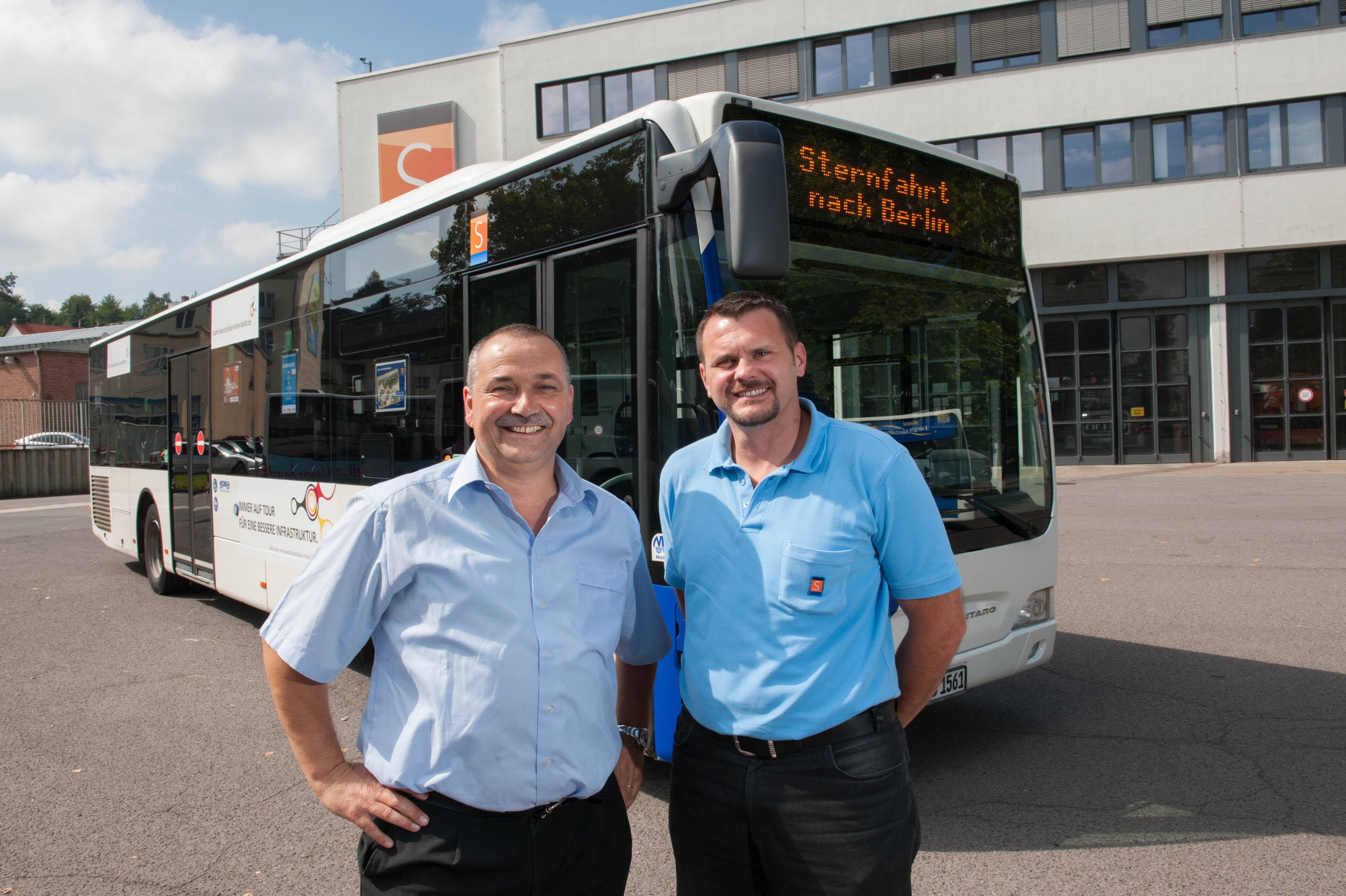 Frank Weber und Dirk Kulling, Mitarbeiter der Saarbahn GmbH, sind für das Saarbrücker Unternehmen am 10. September mit dabei in Berlin. Sie fahren mit dem eigens zu diesem Zweck gestalteten Bus zur Kundgebung.