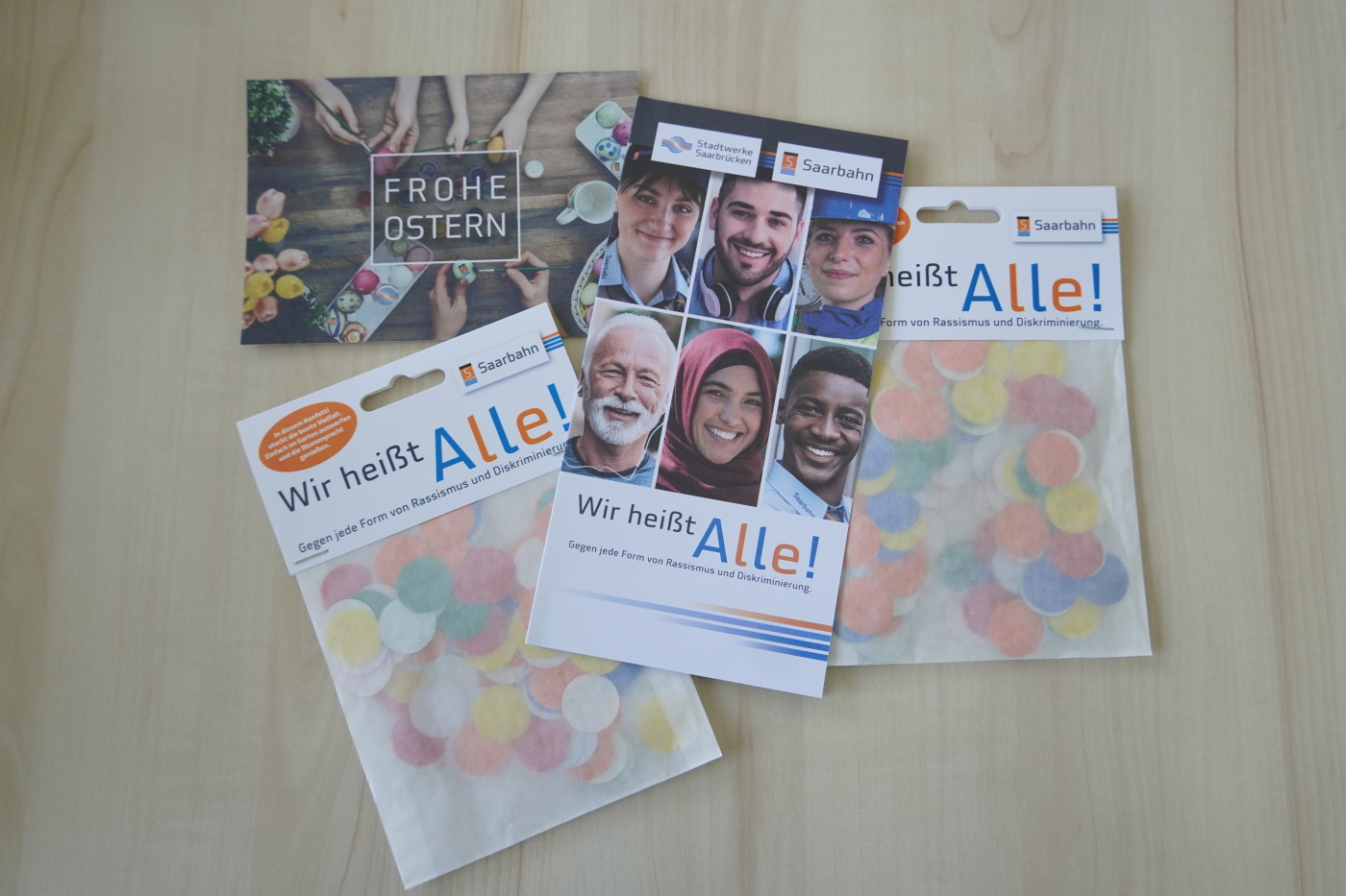 „Die Diskriminierung einzelner Personen oder ganzer Gruppen ist als gesellschaftliches Phänomen allgegenwärtig. Als Stadtwerke-Konzern, zu dem auch die Saarbahn gehört, setzen wir uns mit der Kampagne „Wir heißt Alle!“ gegen jede Form von Rassismus und Diskriminierung ein“ erklärt Peter Edlinger, Geschäftsführer der Saarbahn und des Stadtwerke-Konzerns. Um in Saarbrücken und im ÖPNV auf dieses wichtige Thema aufmerksam zu machen, verteilt die Saarbahn am Gründonnerstag, 14. April 2022, Informationsbroschüren und kleine Geschenke an Haltestellen in Saarbrücken und im Saarbahn Service Center.