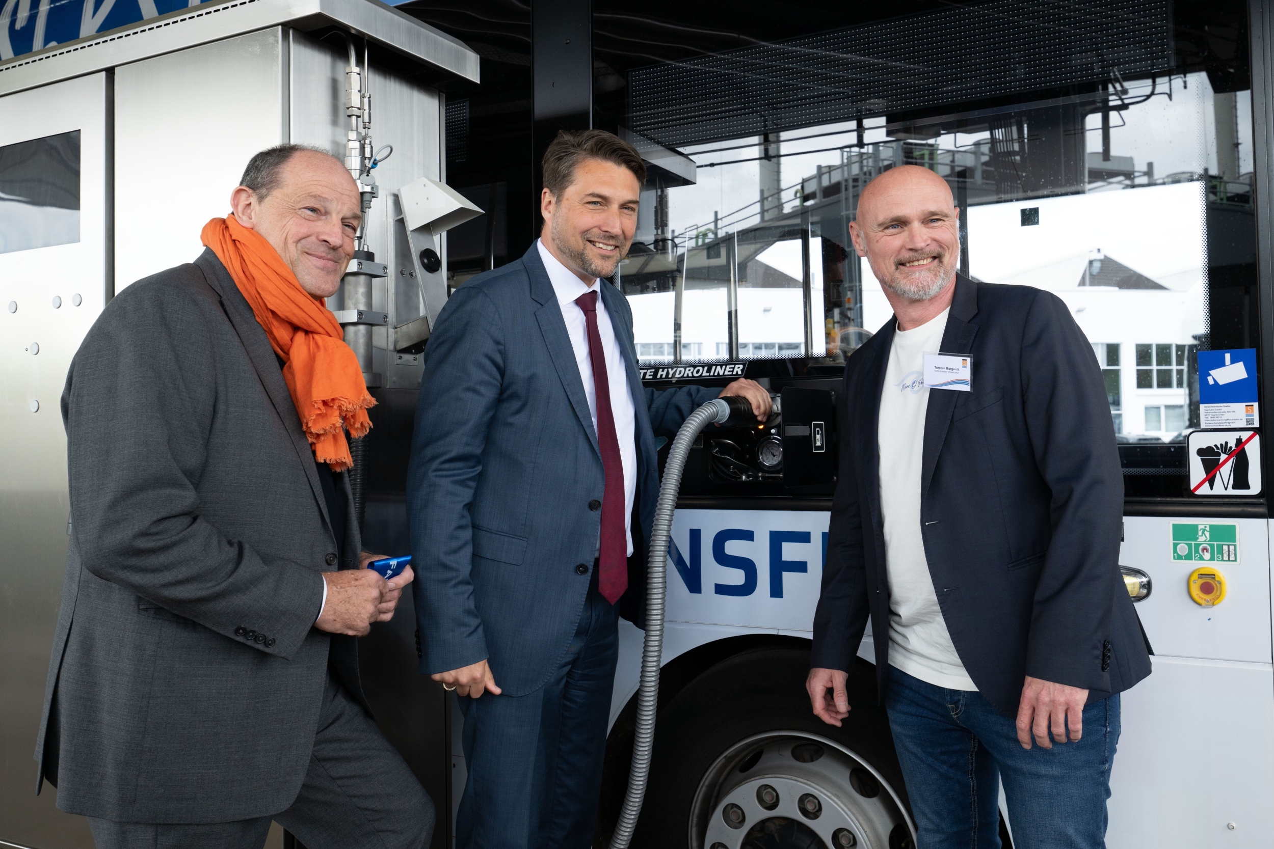 Die Brennstoffzellenbusse (Kite Hydroliner des nordirischen Herstellers Wrightbus) haben fünf Wasserstofftanks mit insgesamt 36,5 Kilogramm Wasserstoff auf dem Dach. „Nach unseren ersten Betriebserfahrungen haben diese Busse eine Reichweite von bis zu 400 Kilometern“, so Burgardt weiter. Der Tankvorgang eines Busses dauert bis zu zehn Minuten.